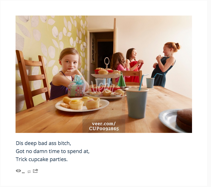 At work we started playing this game where we would shoot each other random Getty Stock Photos and the recipient had to write a haiku for it. Said game then turned into a Tumblr blog. See more at http://haikustockphoto.tumblr.com/